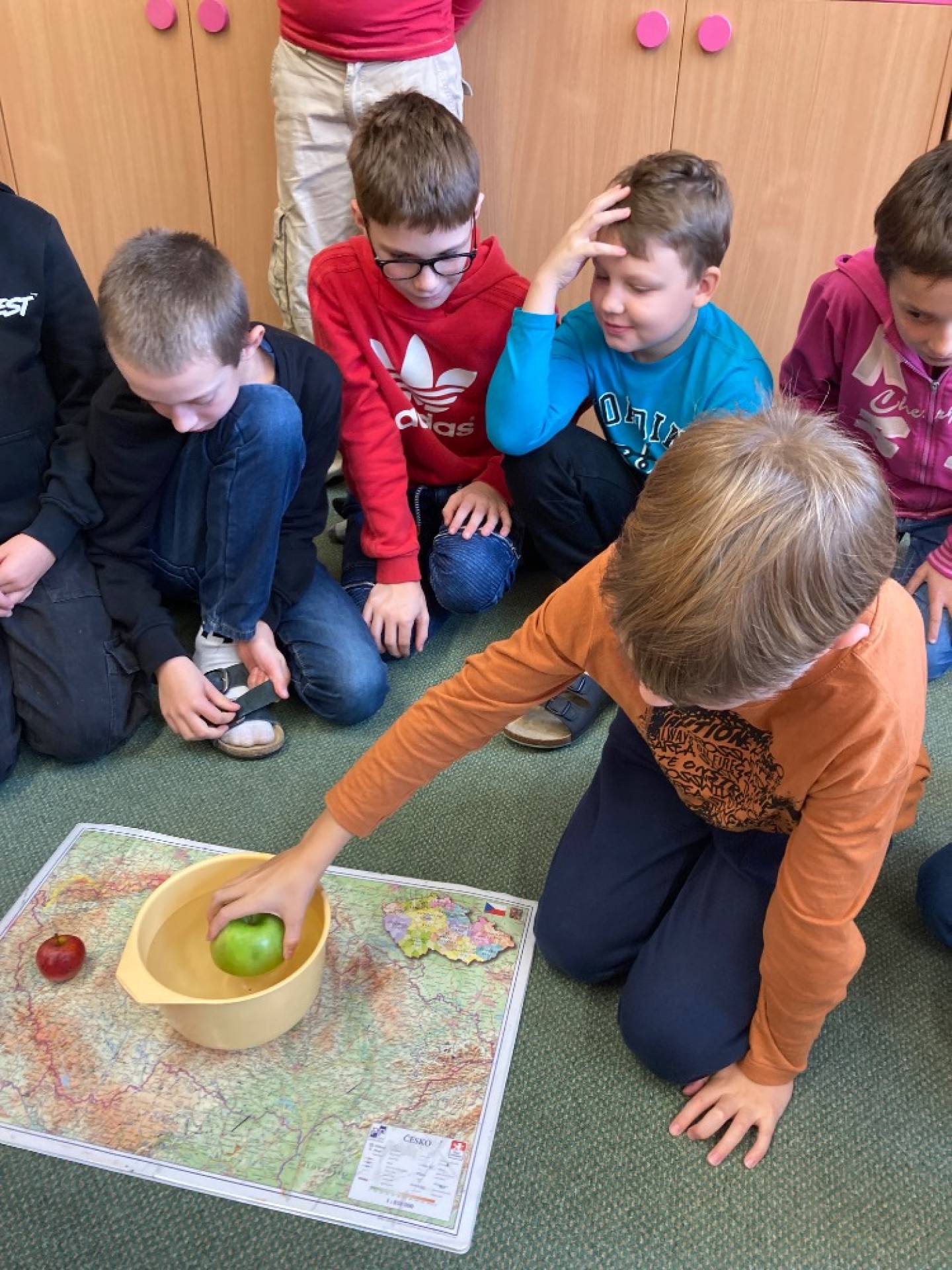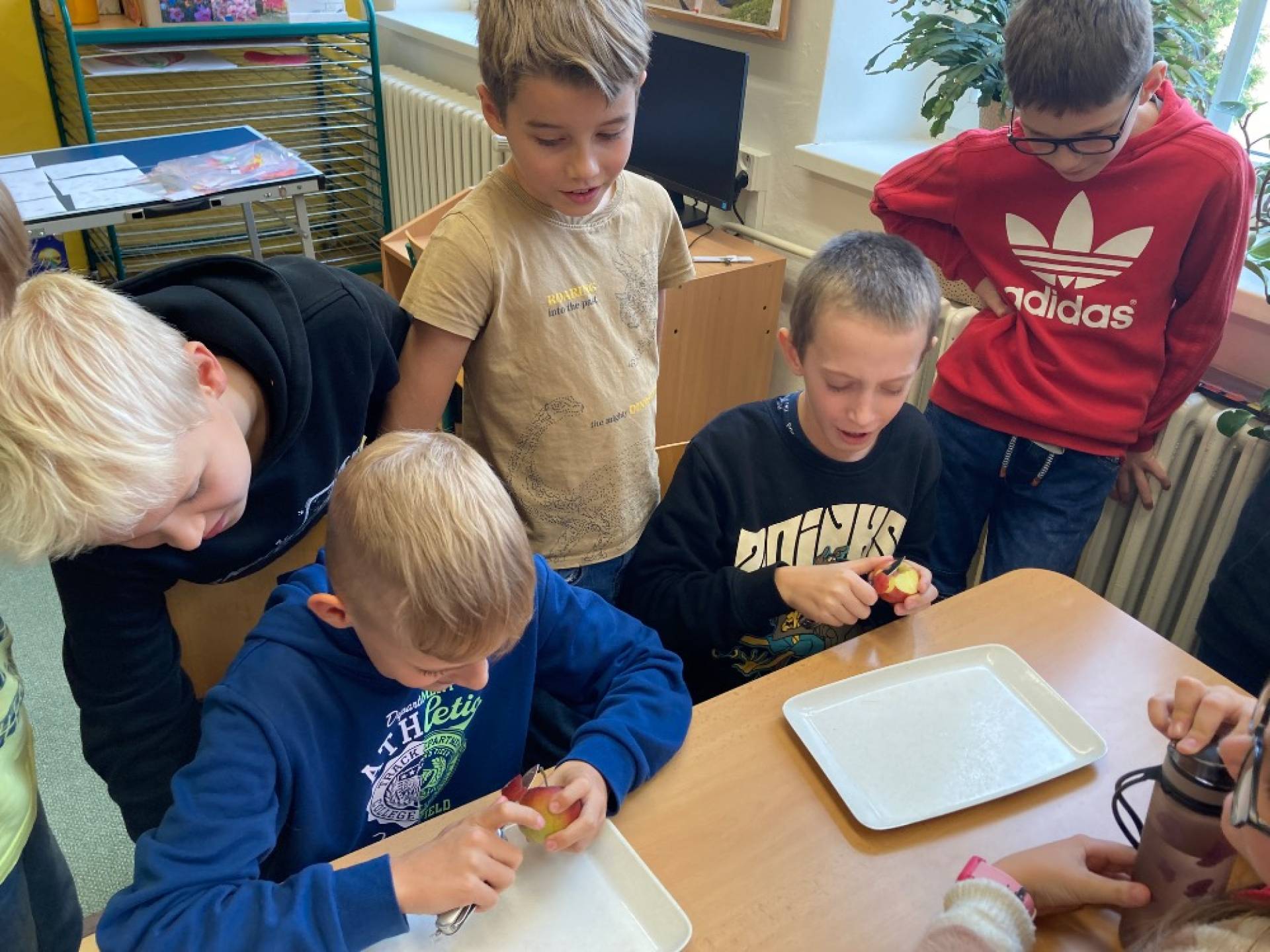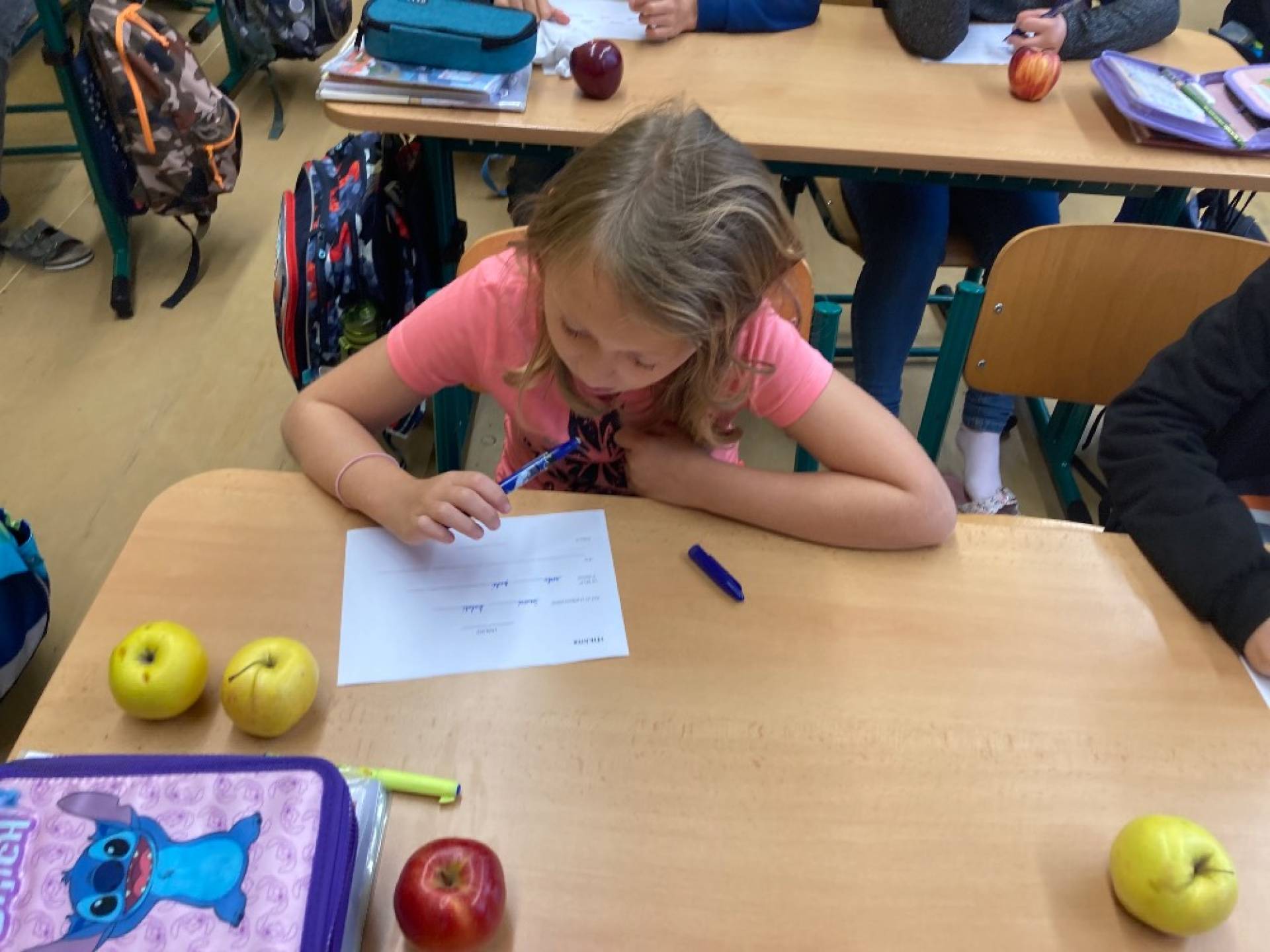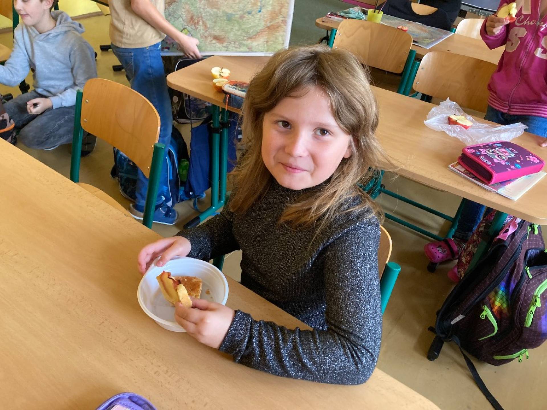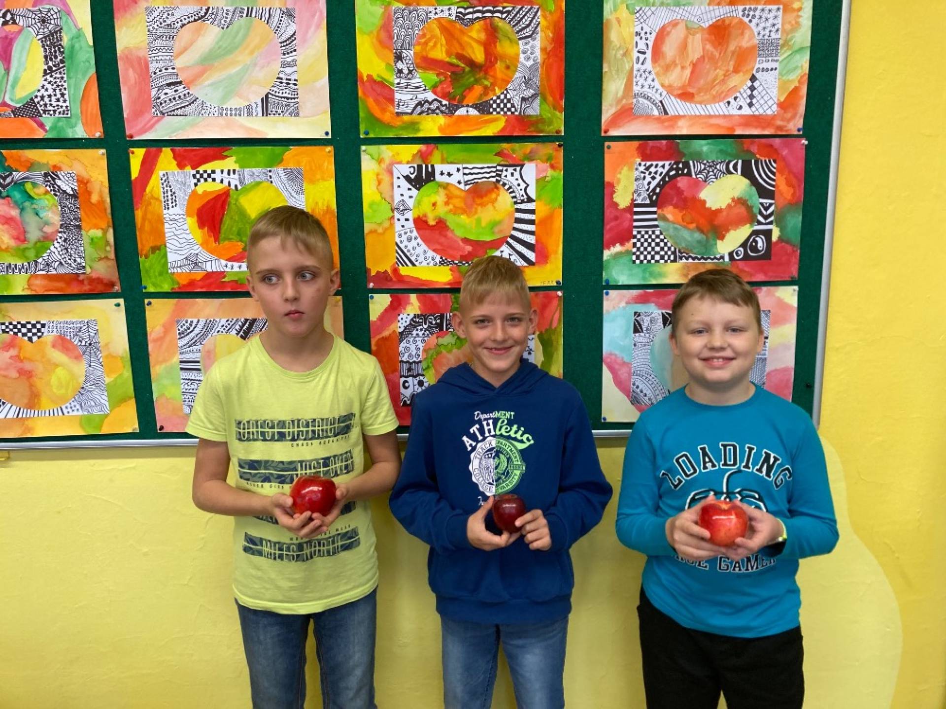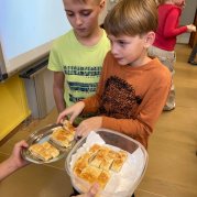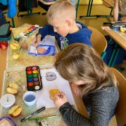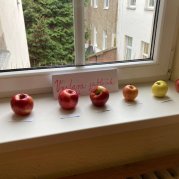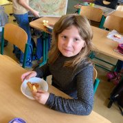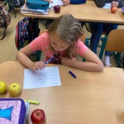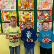 V projektovém dni jablečné téma prolínalo celým dopoledním vyučováním. Proběhla výstavka různých druhů jablíček přinesených žáky ze zahrádek, četli jsme a vyhledávali zajímavé informace o tomto oblíbeném ovoci a jeho blahodárných účincích na zdraví člověka. Nechyběly ani básničky, pohádky a příběhy s jablkem, při hrátkách se slovem jablko opakovali mluvnické učivo z nižších ročníků, s jablíčky jsme počítali ve slovních úlohách, soutěžili v okrajování nejdelší slupky, současně procvičovali praktické měření délky a jednotky délky, zjišťovali hmotnost jablka na digitální váze, porovnávali a převáděli jednotky hmotnosti, také jsme z přinesených jablíček tajnou volbou vybrali to nejkrásnější – dozrálo na zahrádce prarodičů Filipa Slamky. Zpívali jsme písničky, kreslili, stříhali, vyráběli a skládali násobilkové puzzle ve tvaru jablka. Příjemným zakončením Mezinárodního dne jablka byla ochutnávka jablečné pochoutky šikovných maminek našich žáků!